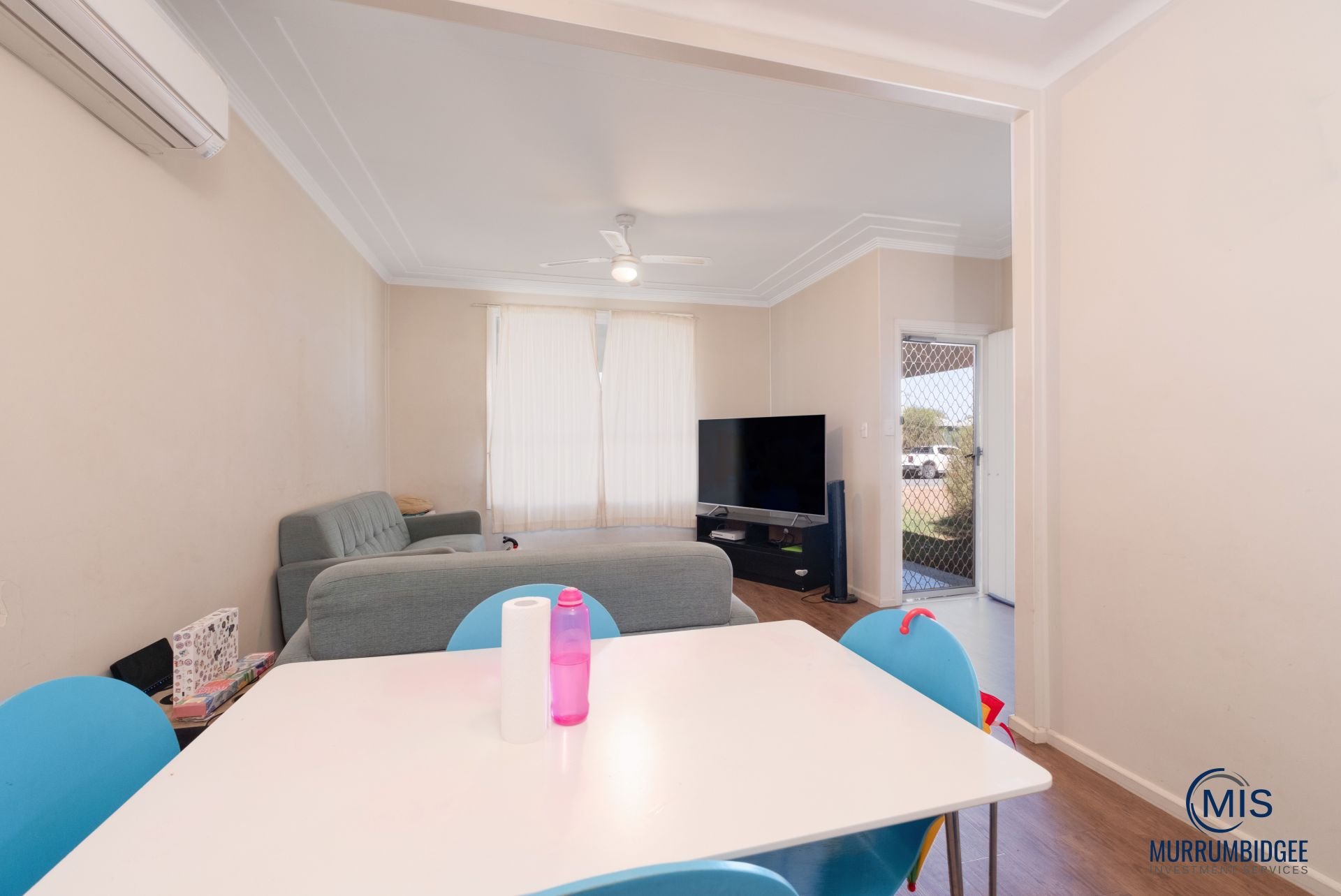 The open-plan living and dining area is equipped with reverse-cycle air conditioning for year-round comfort and flows into the kitchen. Both bedrooms feature built-in wardrobes and ceiling fans. The bathroom includes a shower and toilet, with additional storage available in the hallway linen cupboard.
